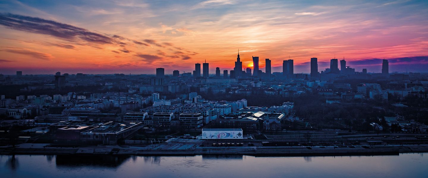 Die moderne Skyline von Warschau wird von dem ikonischen Kultur- und Wissenschaftspalast dominiert, einem der höchsten Gebäude Polens, das eine Aussichtsplattform bietet, von der aus Besucher einen herrlichen Blick auf die Stadt genießen können.