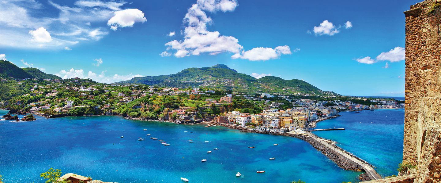 Ischia liegt im Tyrrhenischen Meer, etwa 30 Kilometer von Neapel entfernt und ist die größte der Phlegräischen Inseln. Geografisch ist die Insel von steilen Küsten, sanften Hügeln und üppiger Vegetation geprägt, die eine beeindruckende Kulisse für die malerischen Strände und Dörfer bieten. Die Anreise nach Ischia erfolgt in der Regel mit der Fähre oder dem Tragflächenboot von Neapel oder Pozzuoli, wobei die Überfahrt etwa 1 bis 1,5 Stunden dauert. Die zentrale Lage von Ischia macht sie zu einem idealen Ziel für Tagesausflüge von Neapel oder als Teil einer Erkundungstour durch die Region Kampanien, die auch die Amalfiküste und die Insel Procida umfasst. Die Kombination aus natürlicher Schönheit, kulturellem Erbe und der Möglichkeit, die italienische Lebensart zu genießen, macht Ischia zu einem unverzichtbaren Ziel für Reisende, die die Vielfalt und den Charme dieser einzigartigen Insel entdecken möchten.